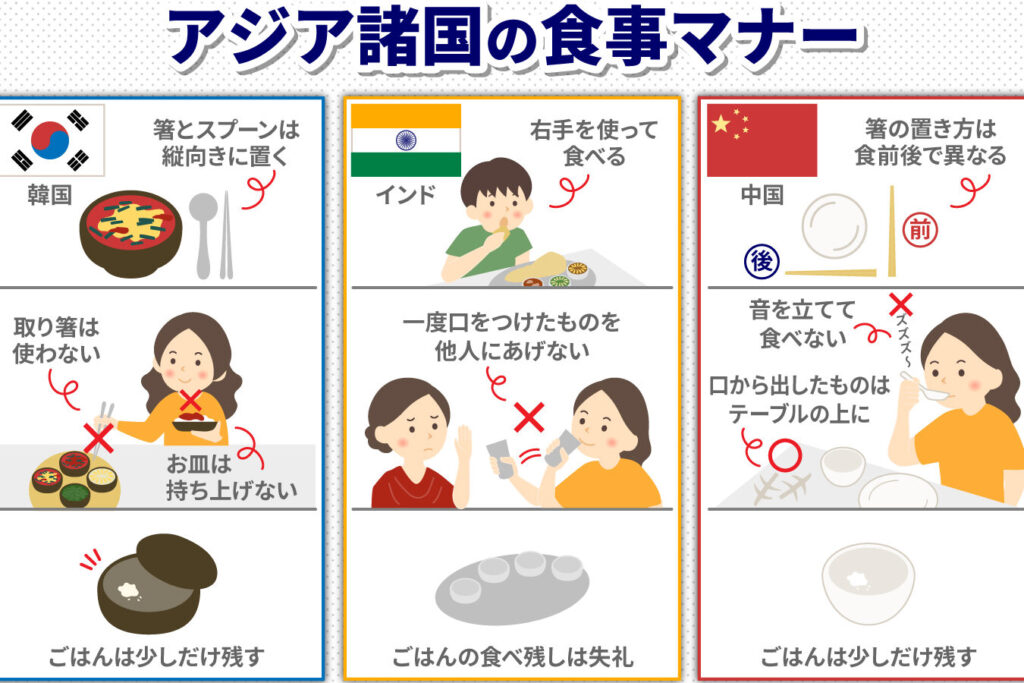 - 食事マナー:食事中は、会話よりも食事を優先し、他者への配慮が必要です。