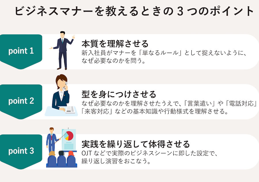 - 基本的なマナーの教育:職場での基本的なマナーやルールを教えることが基本です。