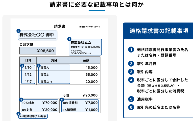 請求書は税務処理において重要な役割を果たします。請求書には、消費税や法人税などの情報が必須です。具体的には、以下の要素が必要になります: