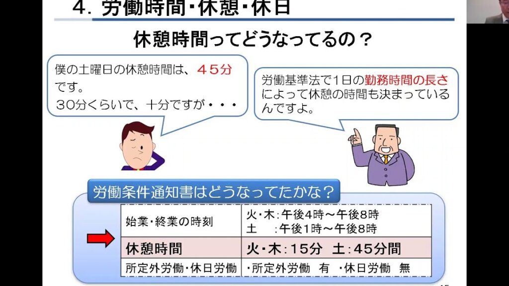 - 休憩: 労働時間に応じた休憩時間を確保することが大切です。労働基準法により、一定の労働時間を超えると休憩を取る必要があります。