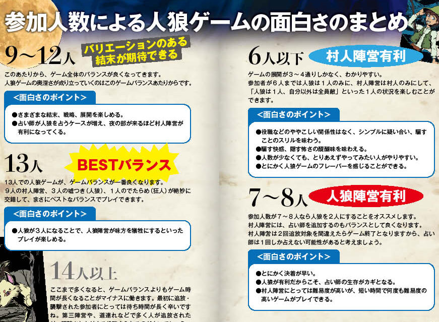 - 参加者数: 6人から15人の参加者が理想。人数によって役割のバランスが変わるため、遊びやすさが増す。