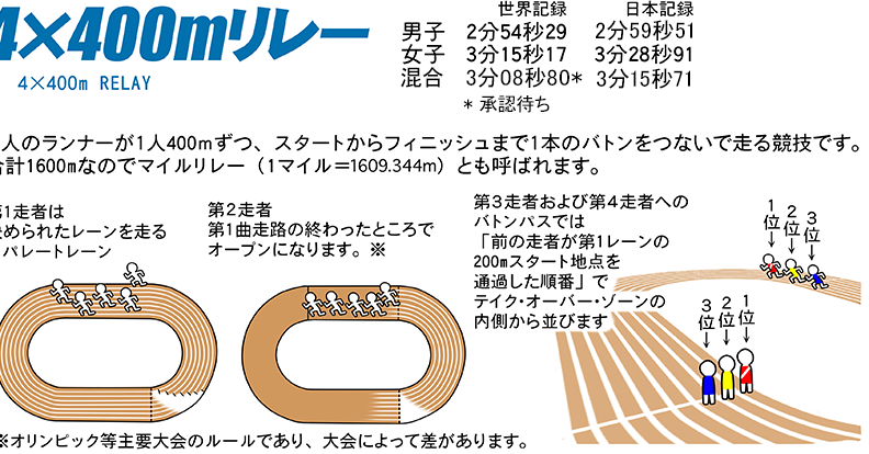 - バトンの受け渡し: 選手は、指定されたゾーン内でバトンを受け渡すことが求められます。このゾーンを越えると失格となります。