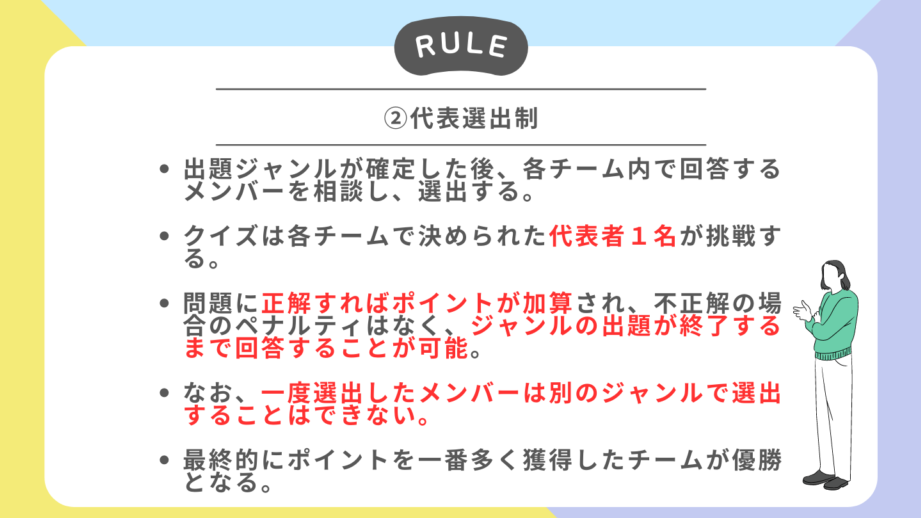 クイズの参加人数もルールに影響を与えます。一般的な指針は以下の通りです。