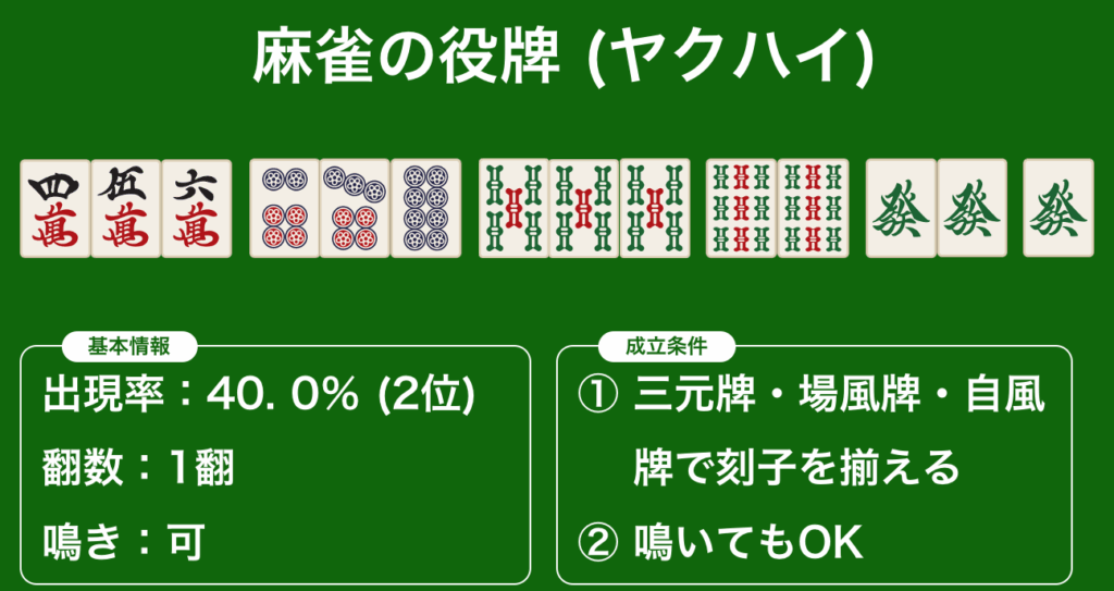 - 三元牌: 白、發、中のどれかを含む役。特に得点が高いです。