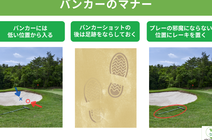 - バンカー内の余分な痕跡を残さないこと。 ショット後、できるだけ元の状態に戻す努力が求められます。