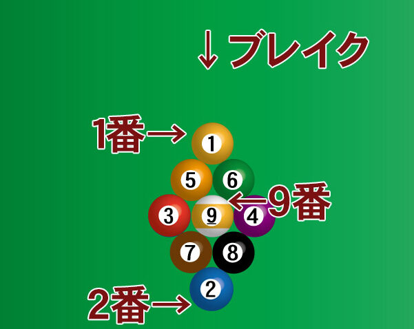 - ボールのセット: 1番から9番までのボールを、三角形に並べます。このとき、1番ボールを前に、9番ボールは中央に配置します。