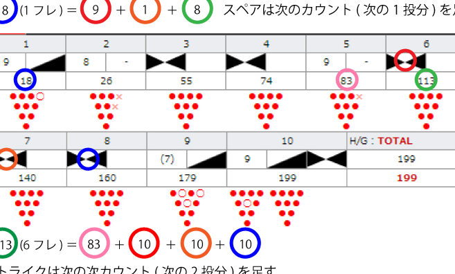 - スペアを取った場合、次のボールで倒したピンの数が加算されます。