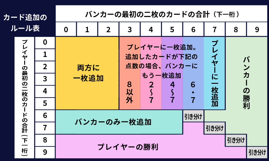 - ポイント計算: 各カードの点数を合計し、最も9に近い方が勝ちとなります。