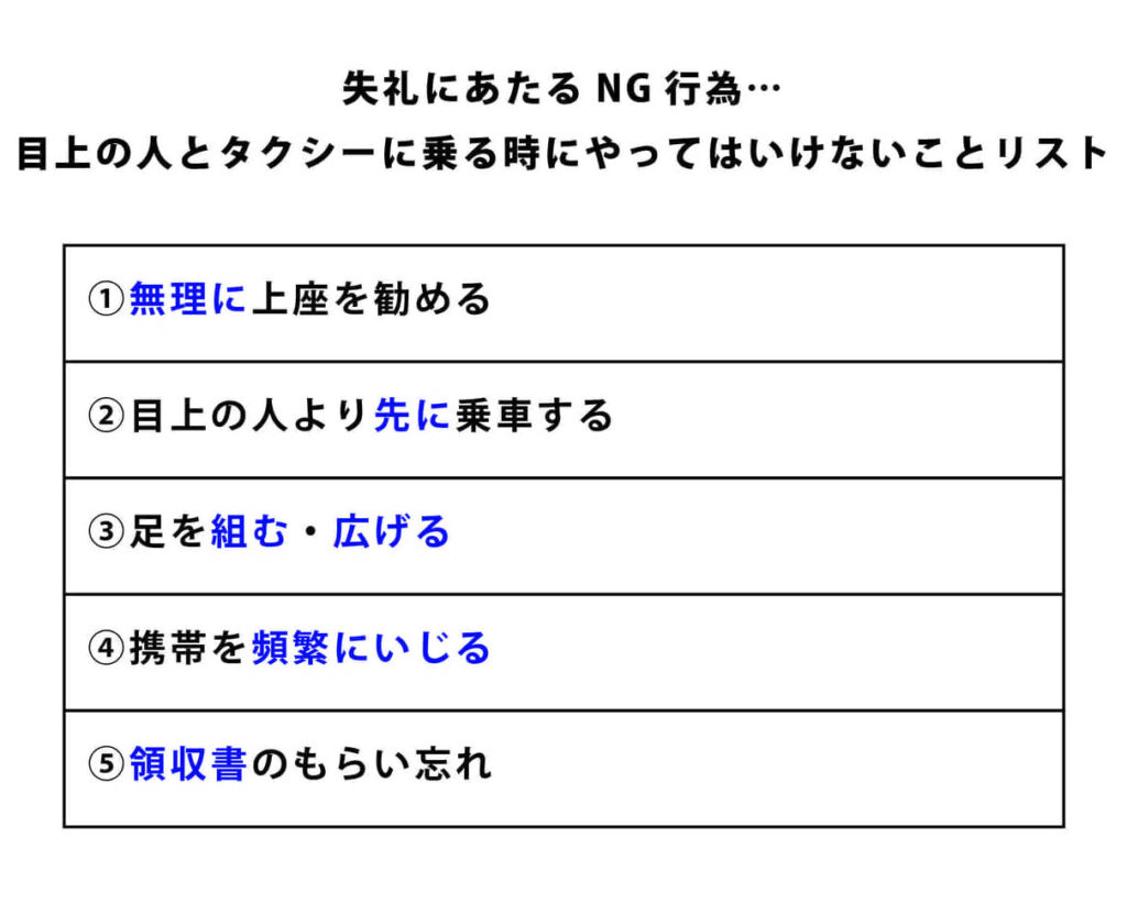 私たちがタクシーに乗るときは、以下のマナーを意識することが大切です。