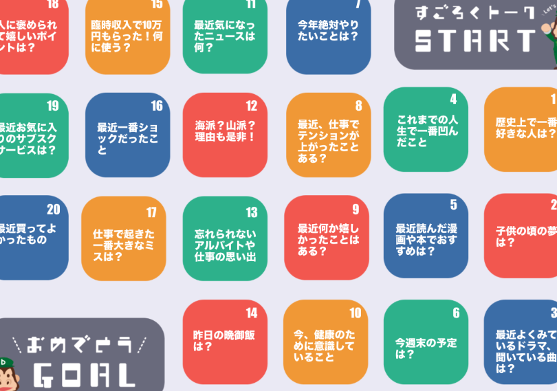 - 罰ゲームマス:このマスに止まると、罰として特定の行動が求められます。