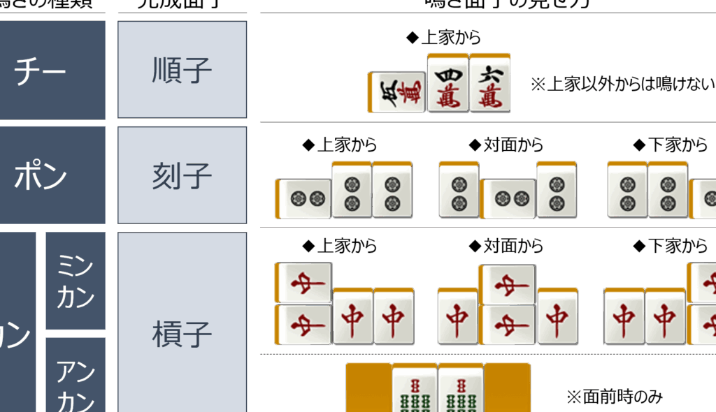 - 鳴き(なき): 他のプレイヤーが捨てた牌を使って役を作る行為。これにより、プレイヤーは手を早く進められる。