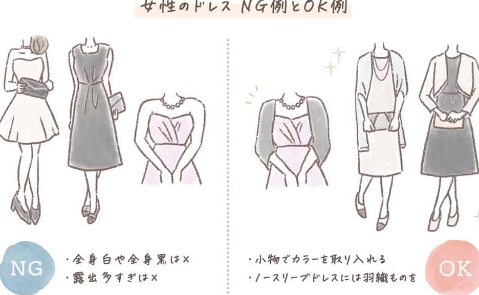 - 裾やデザインに注意し、あまり派手なものや白い衣装は避けます。