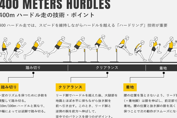 - 400メートルハードル:長距離を含む競技。この競技では、短距離に比べて持久力が必要です。選手は多くのハードルを越える中で、ペース配分が重要です。
