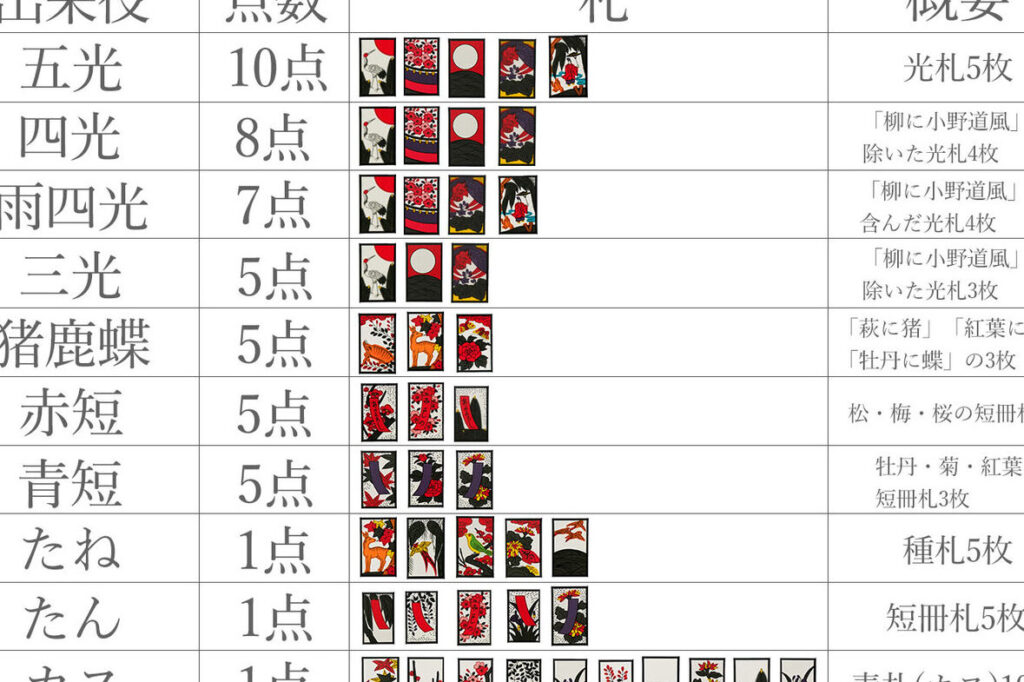 - 役:特定のカードの組み合わせで得られる点数。例えば、「タネ」と呼ばれる特定のカードが集まることで形成される役は、高得点となります。