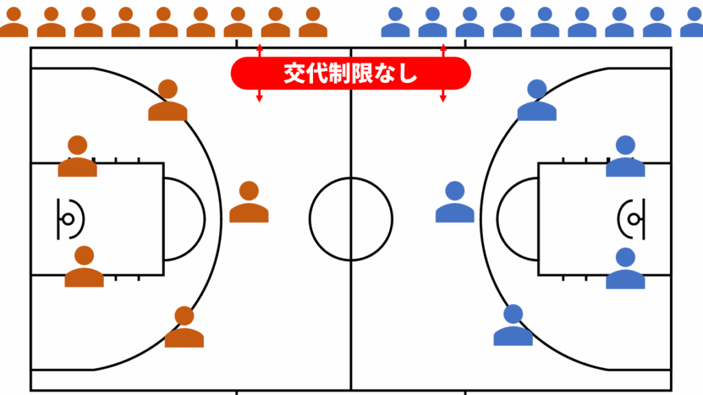 各チームは5人の選手で構成される。ポジションとしては、ポイントガード、シューティングガード、スモールフォワード、パワーフォワード、センターがある。選手たちは、攻撃と防御の役割を持ち、それぞれのポジションに特有の技術が求められる。また、チームには最大で7人の控え選手がいることが一般的で、選手交代が可能である。