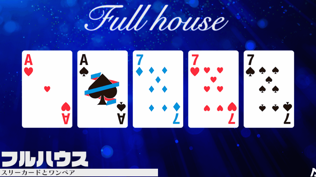 フルハウスの強さは、3枚のカードがどの数字かによって決まる。例えば、3枚の「7」と2枚の「4」であれば、他のフルハウスに勝つ可能性が高くなる。