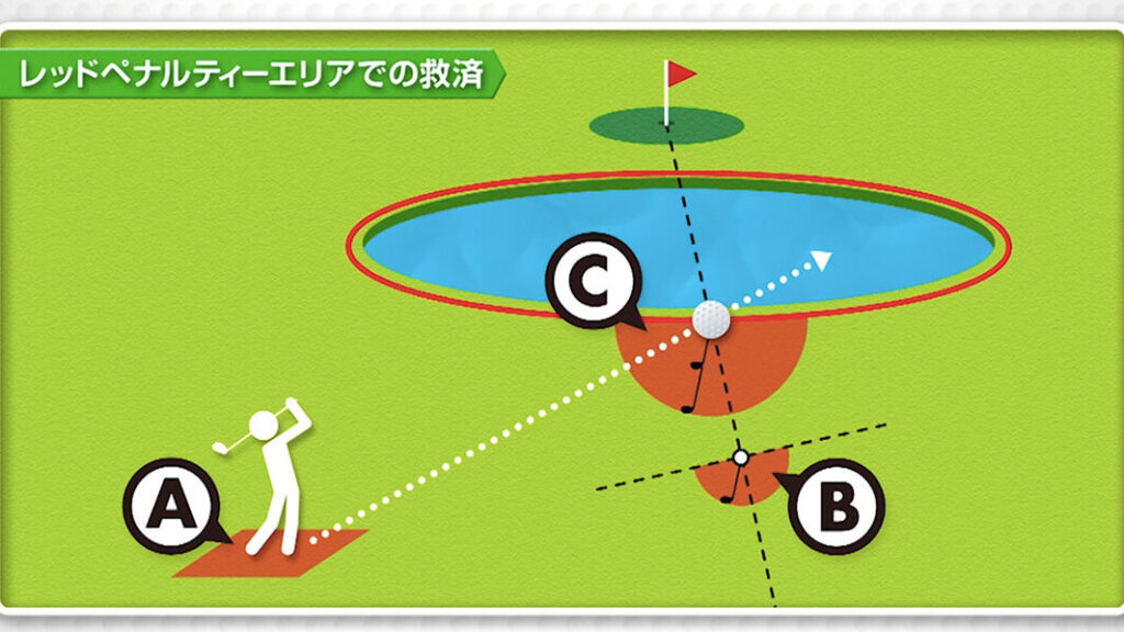 - 赤杭の位置から2クラブレングス以内でボールを落とす。この方法も選択肢に入ります。