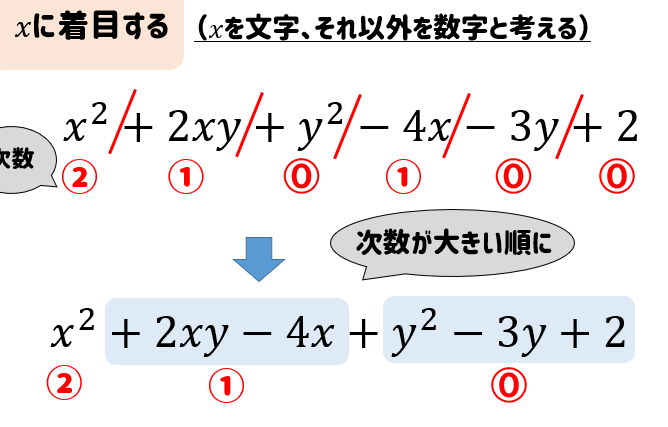 降べきの順とは、項をその次数に応じて整理する方法です。具体的には、次数の高い項から低い項の順に並べます。この順序で整理することで、計算の見通しが良くなります。