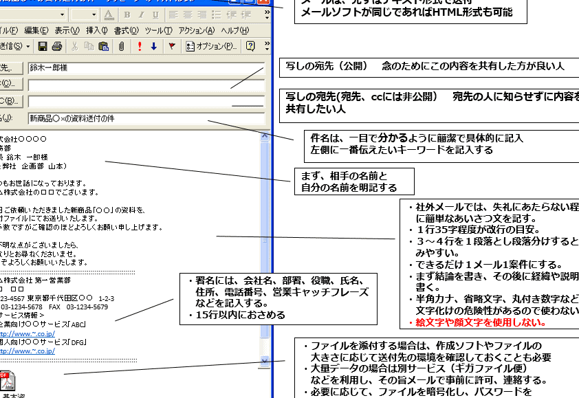 - CCやBCCの使い方。受信者のプライバシーを尊重し、適切に設定します。