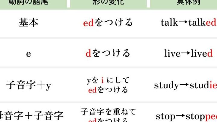 - 規則動詞は通常、動詞の末尾に「ed」を付けることで過去形を形成する。