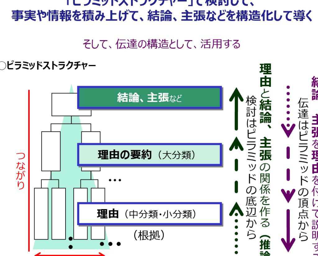 ピラミッドルールは、情報を効果的に整理し、伝達するための手法です。このメソッドでは、情報をピラミッド型に構造化します。最上部には主な結論やメッセージを置き、その下に支持する理由や具体的なデータを配置します。このように構造化することで、受け手にとって理解しやすくなります。