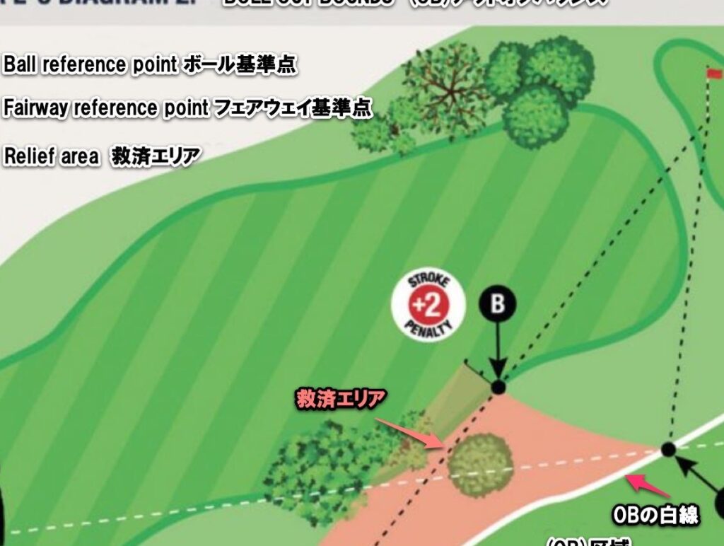 - 最初にショットを打った地点から1打のペナルティを受けて再開。