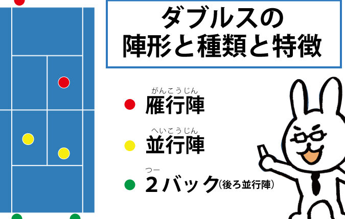 プレースタイルには、攻撃型と守備型がある。攻撃型はネットに近づき、積極的にポイントを獲得する。守備型は、相手の攻撃を耐えつつ、反撃のチャンスを狙う。以下のポイントを考慮する。