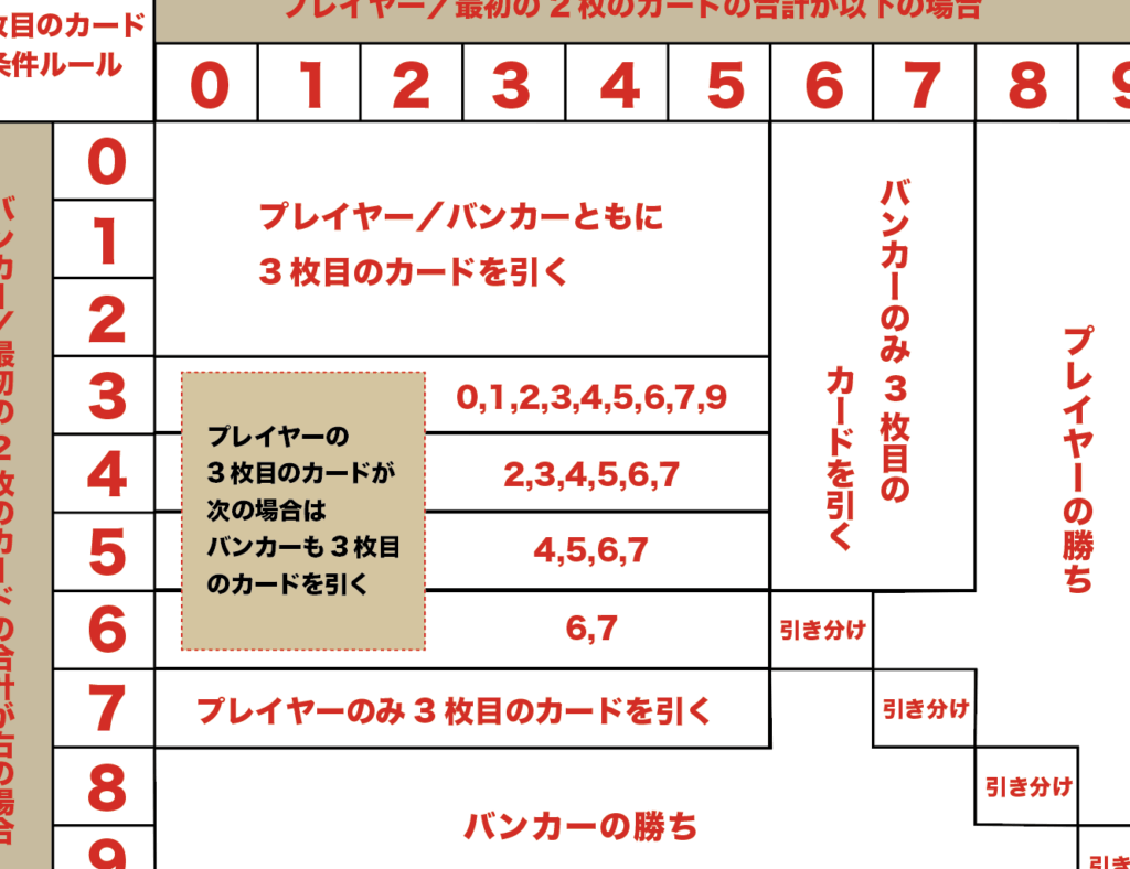 - バンカーに賭ける: バンカー側が勝つと予想する場合。バンカーに賭けた場合、配当は少し低くなりますが、勝率が高いです。