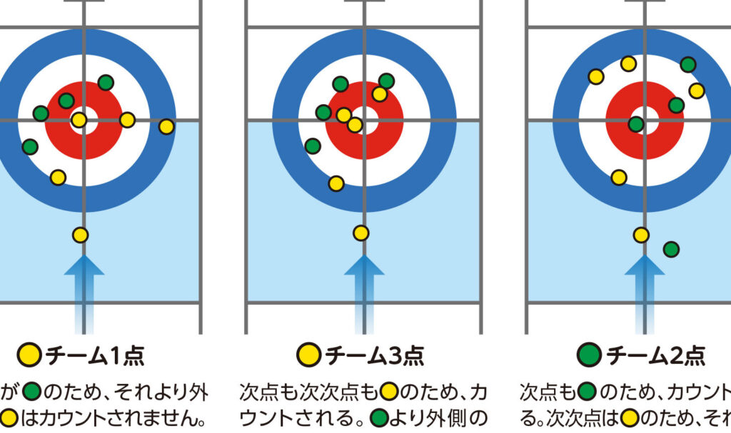 - スコアの付け方: 試合終了後、ハウス内のストーンを全て確認し、最もテッペンに近いものによって得点が決まる。