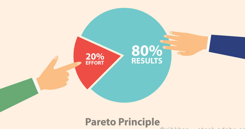 80 20 ルール、またの名をパレートの法則は、イタリアの経済学者ヴィルフレド・パレートが1896年に提唱しました。彼は、イタリアの富の約80%が、人口の20%の人々によって所有されていることに気づきました。この観察から、少数の要因が大部分の結果を生むことが広く認識されるようになりました。