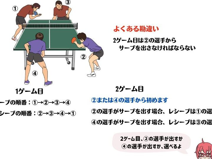 - 各ペアが交互にサーブを行います。サービス順は試合開始前に決定します。