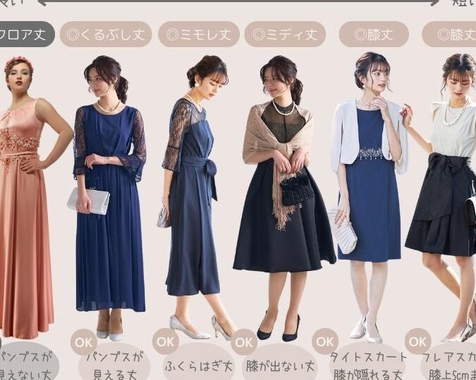 カクテルドレスは、招待客の中でもカジュアルながらもエレガントなスタイルです。多くの場合、膝丈やミモレ丈が特徴で、明るい色合いやユニークなデザインが好まれます。カクテルドレスは、以下の要素を考慮することで選びやすくなります。