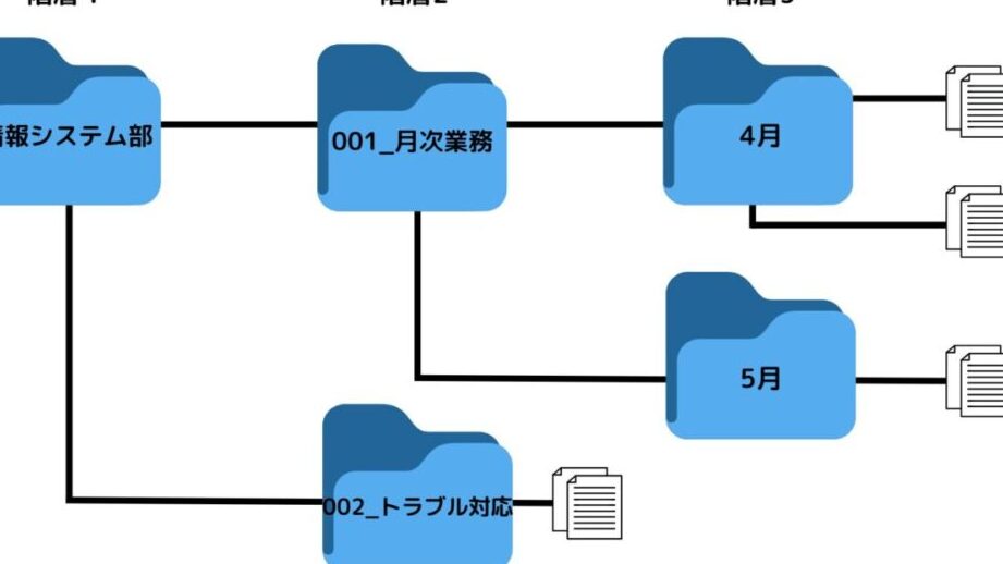 - 論理的な階層: フォルダは、関連するファイルをグループ化します。一般的には、プロジェクト名や部門名でフォルダを分ける方法が有効です。