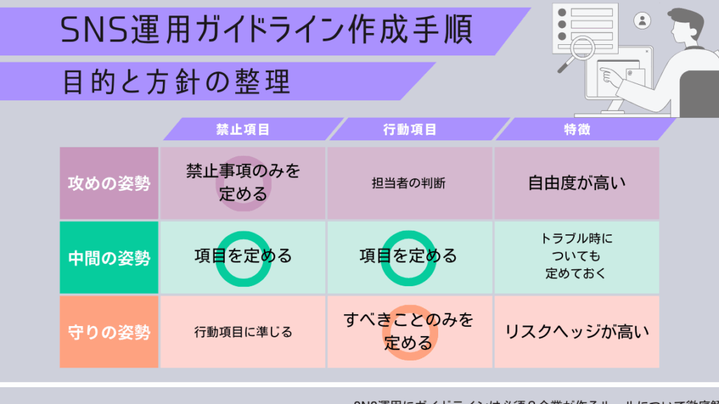 - ソーシャルメディアポリシーを明確に設定し、全社員に周知する