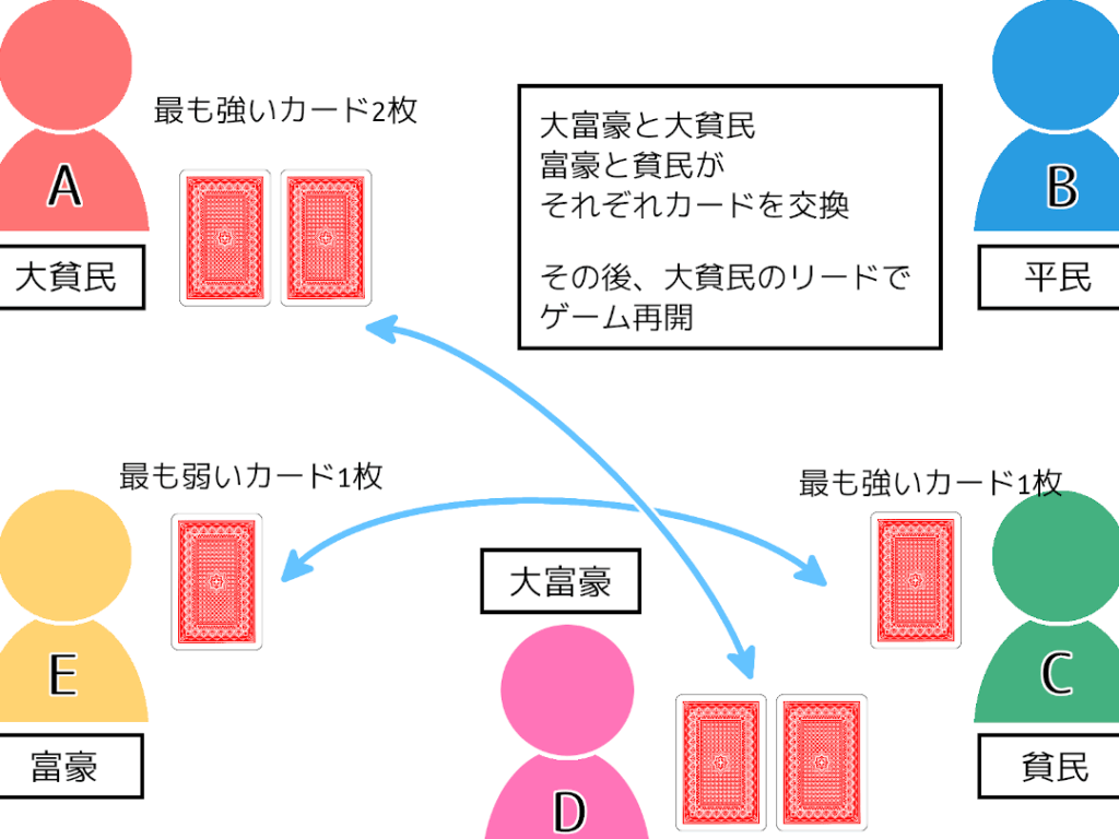 - 役の強さランキング: 大富豪、貧民、通常のプレイヤーがあります。この役職によって、次のラウンドでのプレイが変わります。