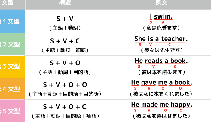 - SVC(主語+動詞+補語): 例として、「彼は学生です。」がある。この文型では、補語が主語の状態や属性を示します。