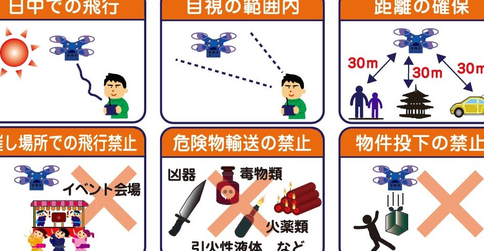 ドローンの種類によって遵守するべき飛行ルールが異なる。以下は、一般的なルールの例です。