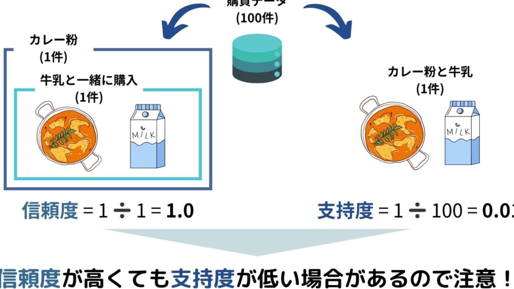 - Aprioriアルゴリズム: 頻出アイテムセットを生成し、その後、信頼度を計算する基本的な方法。