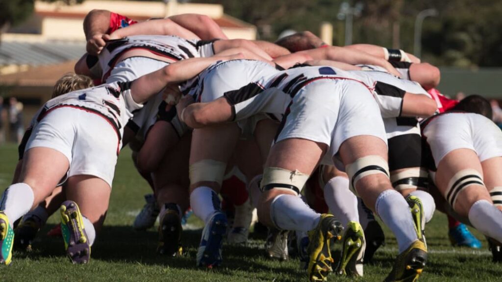 - スクラム: フォワードの選手たちが集まり、ボールを奪い合う。