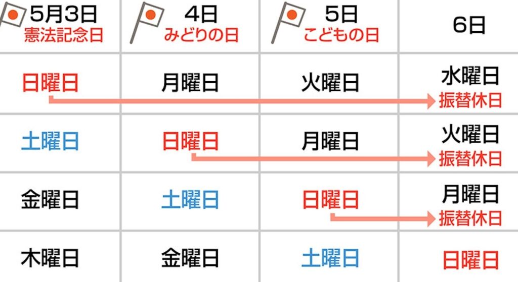 - 祝日が日曜日の場合:翌月曜日が振替休日