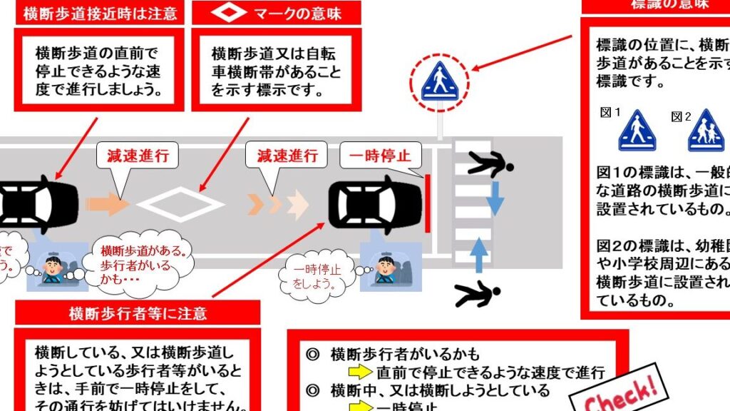 車両は横断歩道前で必ず減速し、歩行者に道を譲る義務がある。信号機のある場所では、赤信号の際は完全に停車します。信号の無い横断歩道では、歩行者が優先していることを念頭に置き、自分の進行方向に歩行者がいる場合、必ず停止するようにします。車両が守るべきポイントは以下の通りです。