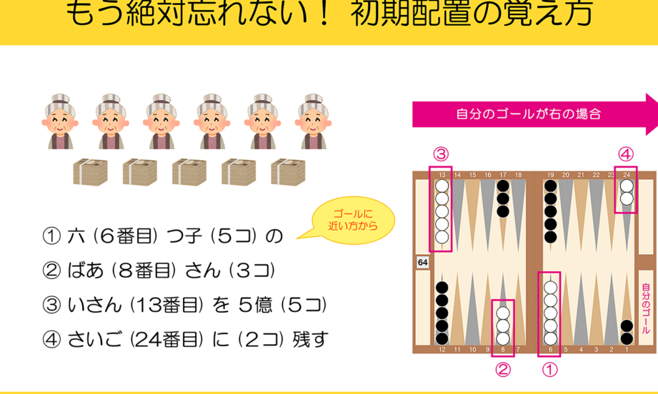 バックギャモンは、各プレイヤーがサイコロを振って、出た目の合計が大きい方が先手となります。プレイヤーはそれぞれ、自分の駒をボードのスタート位置から動かし始めます。駒の配置は以下のようになります:
