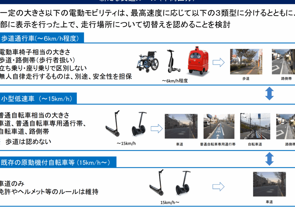- 通行場所: 歩道の通行は原則禁止ですが、自転車専用道や車道を利用できます。