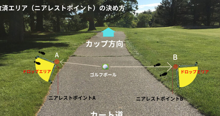- ゴルフカートの通路にボールが転がった場合: プレイヤーはボールをその場から自由に移動できます。通路上の障害物によるペナルティはありません。