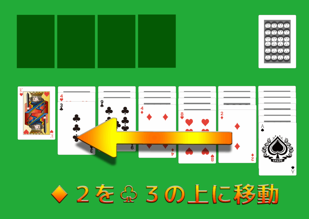 - 重要なカードを後回しにする。裏向きのカードと特定のスートのカードを後回しにしがちです。早めに表に出すことで、勝利条件が満たしやすくなります。