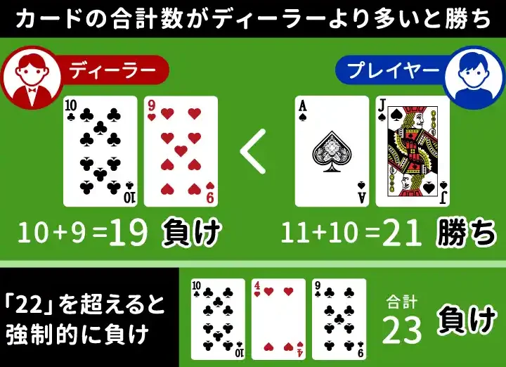 - プレイヤーとディーラーの合計が同じ場合、引き分けとみなされます。