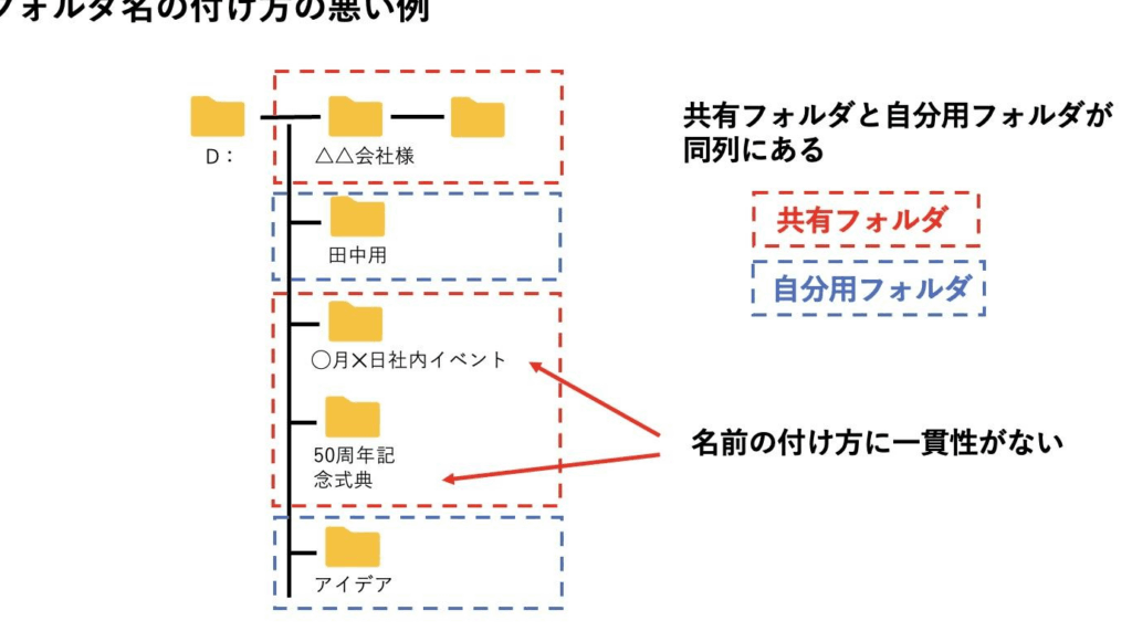 - 命名規則の統一: 各フォルダの名称に一貫性を持たせ、利用者が直感的に理解できるようにします。