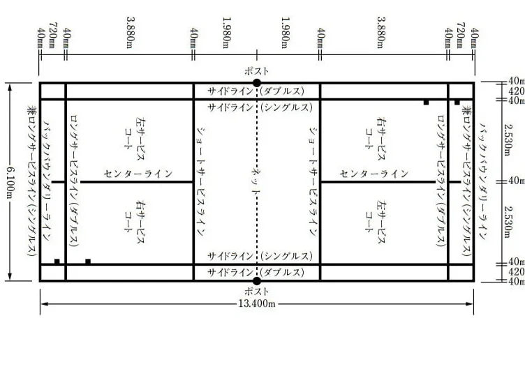 コートの両端には、サービスラインがある。サービスラインは、ネットから1.98メートルの距離に配置され、サーブを行う際の重要なガイドラインとなる。コートの中央にはネットが設置されており、ネットの高さは1.55メートルである。