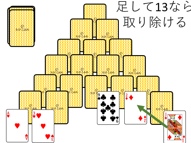 - カードの配置: ピラミッド型にカードを配置し、全てのカードを表向きにします。
