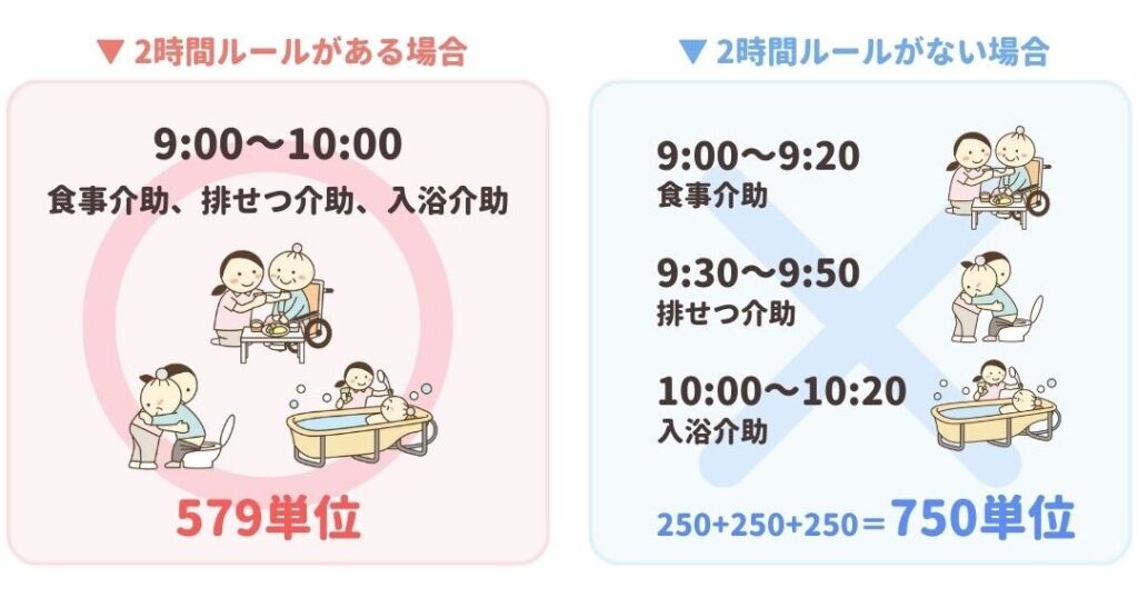2時間ルールの背景には、介護サービスの質を確保する必要があります。訪問時間が短いと、十分な支援が行えない場合が多いです。具体的には、利用者の状態に応じて、1回の訪問で複数のサービスを提供するため、2時間という時間枠が定められています。